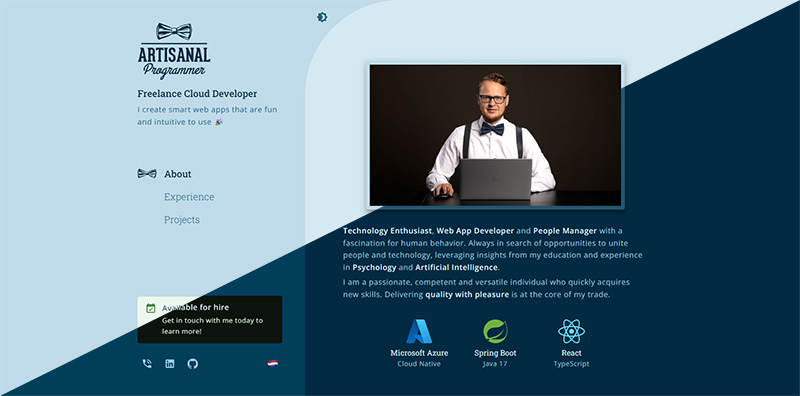 Technologiefanaat, Lead Web App Developer en People Manager met een fascinatie voor menselijk gedrag. Altijd op zoek naar mogelijkheden om mensen en technologie samen te brengen, gebruikmakend van inzichten uit mijn opleiding en ervaring in Psychologie en Kunstmatige Intelligentie.